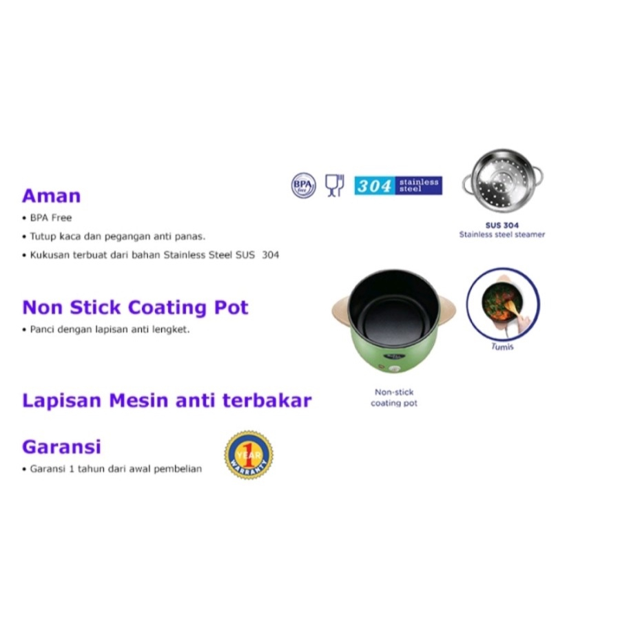 Multi Cooker merupakan mesin multifungsi dengan kapasitas 1 L, yang dapat digunakan untuk menggoreng, menumis, mengukus, menghangatkan dan memasak aneka makanan.
